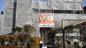 外壁の周りに囲う足場を建ててから、屋根にも足場を組むことを指します。