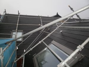 屋根が急勾配の時、屋根の天辺まで登れないので足場をかけて登れるようにするためです。