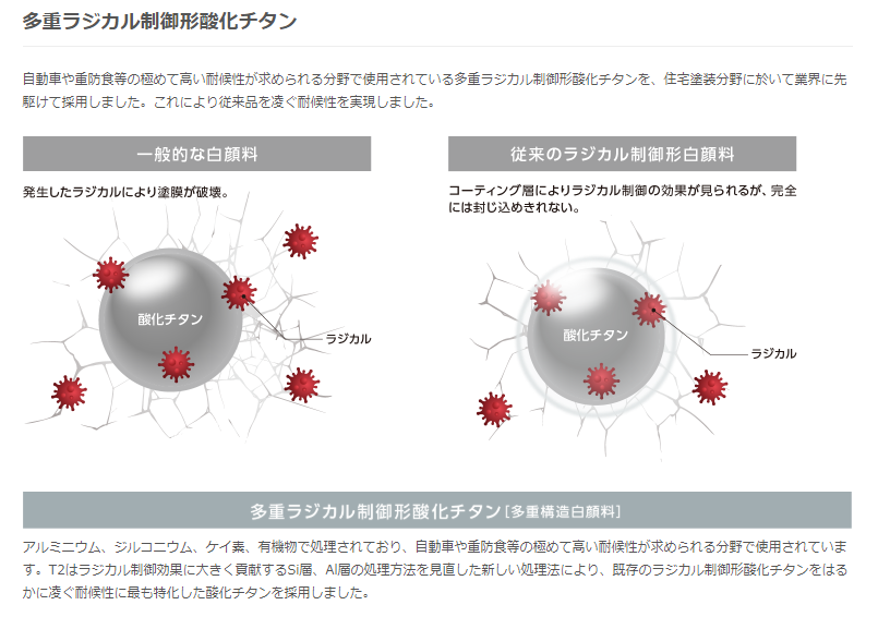 塗膜の劣化原因は、酸化チタンに紫外線や酸素・水が当たると、酸化チタンからラジカルが発生し、このラジカルが塗膜を壊す原因になっています。