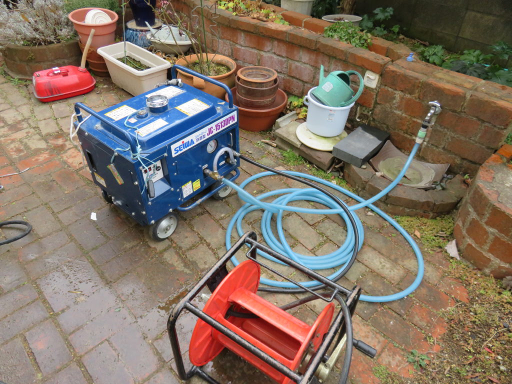 洗浄機はガソリンを入れて、エンジンを回します。回したエンジンで空気圧縮し水を洗浄用のホースへ送り込みます。