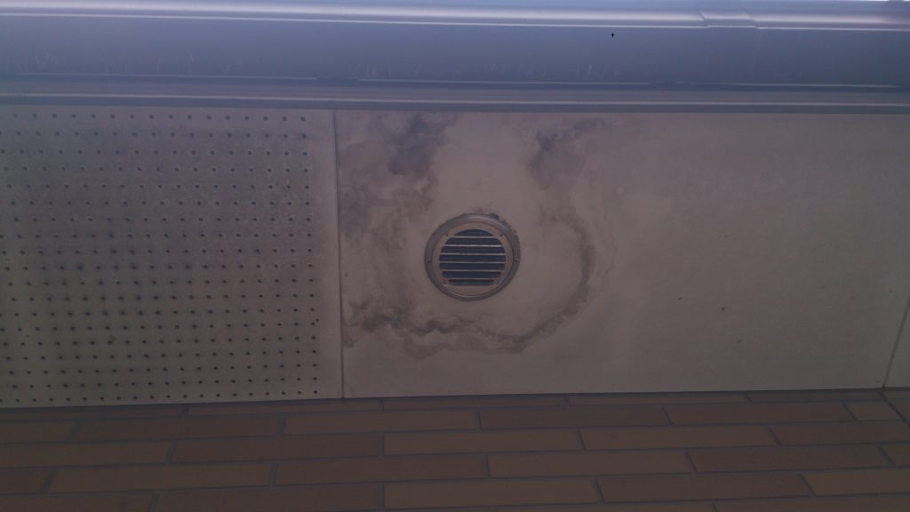 軒天の汚れは、屋根からの雨漏り、又、軒樋に何か詰まって雨水が溢れた為等色々です。