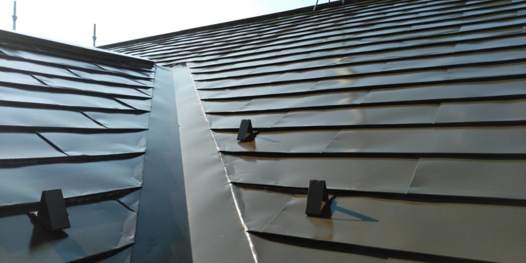 屋根は鋼板でさび止め塗装が完了後、刷毛でローラーでは入りにくい箇所を塗っていきます。