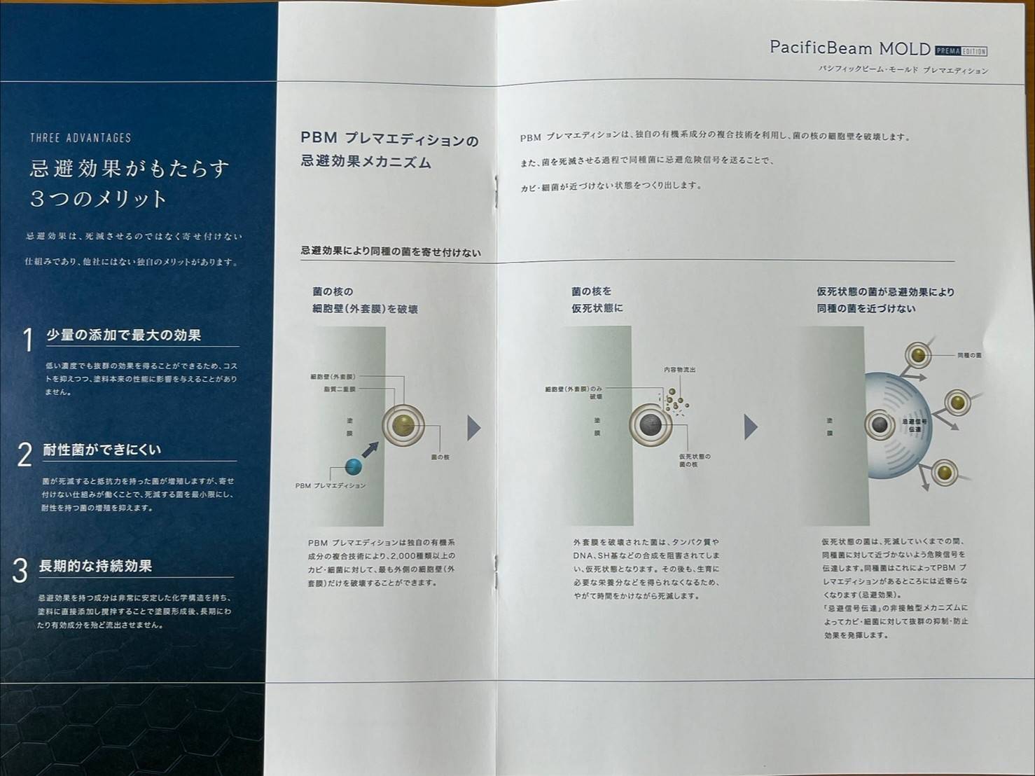 上塗り塗料に少量添加するだけ、カビや細菌の発生を抑制し、建物の美観を長期的にわたり保持します (プレマテックス、カタログより抜粋)