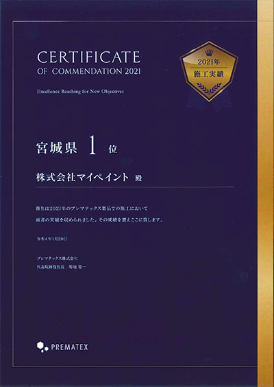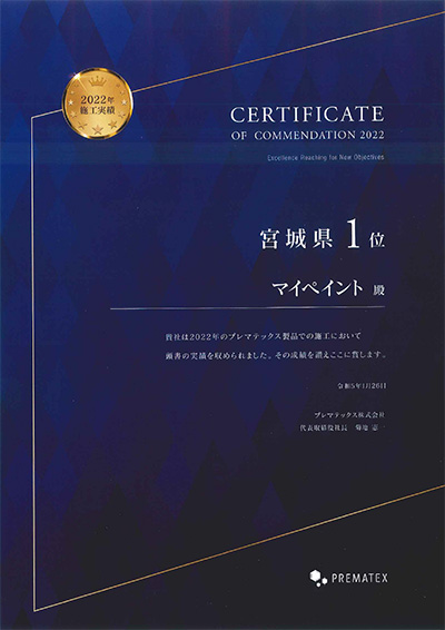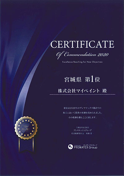 昨年度も塗料メーカーのプレマテックス社より宮城県施工実績1位の表彰をいただきました!