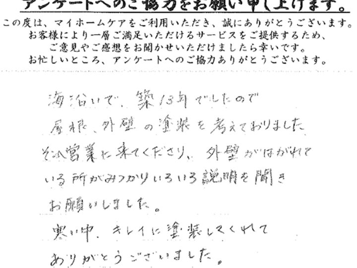 海沿いで、築13年でしたので屋根・外壁の塗装を考えておりました。そこへ営業に来てくださり、