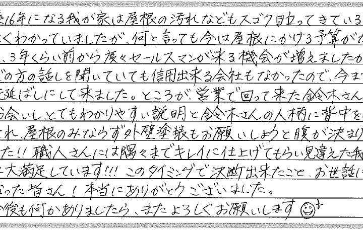 さんの人柄に背中を押され、屋根のみならず外壁塗装もお願いしようと腹が決まりました。