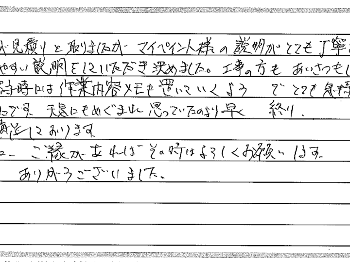 何社か見積取りましたがマイペイント様の説明がとても丁寧でわかりやすい説明をしていただき決めました。