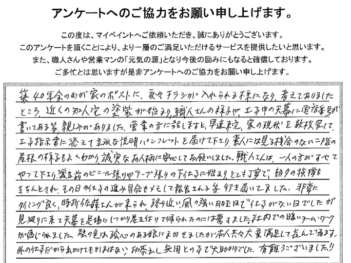 お客様からうれしいアンケートを頂きましたので掲載いたします。