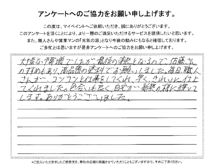 お客様からうれしいアンケートを頂きましたので掲載いたします。