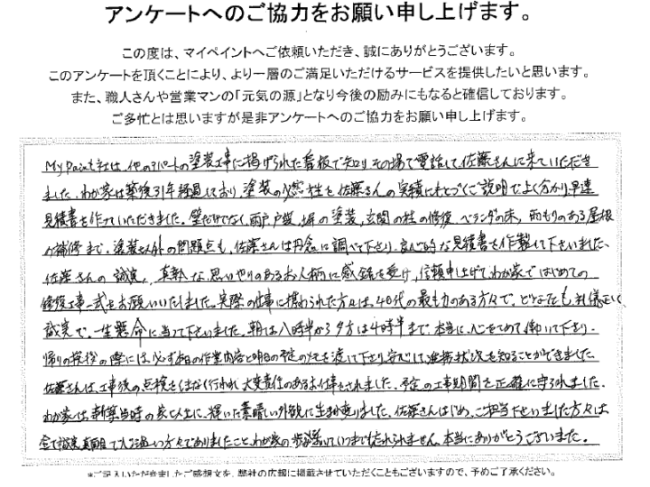 マイペイント社は、ほかのアパートの塗装工事に揚げられていた看板で知りその場で電話して佐藤さんに来ていただきました。