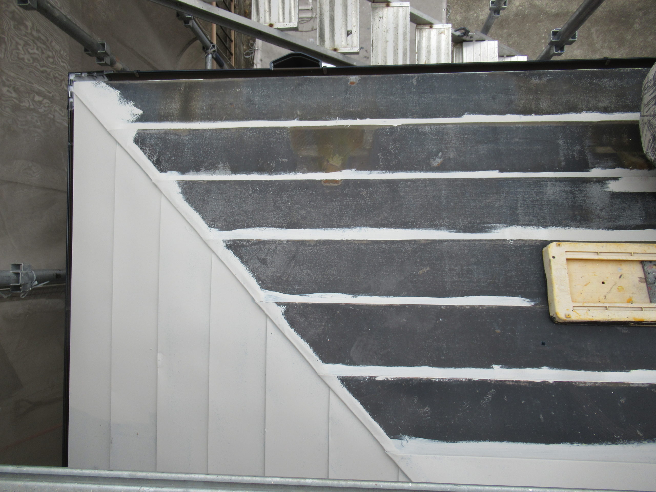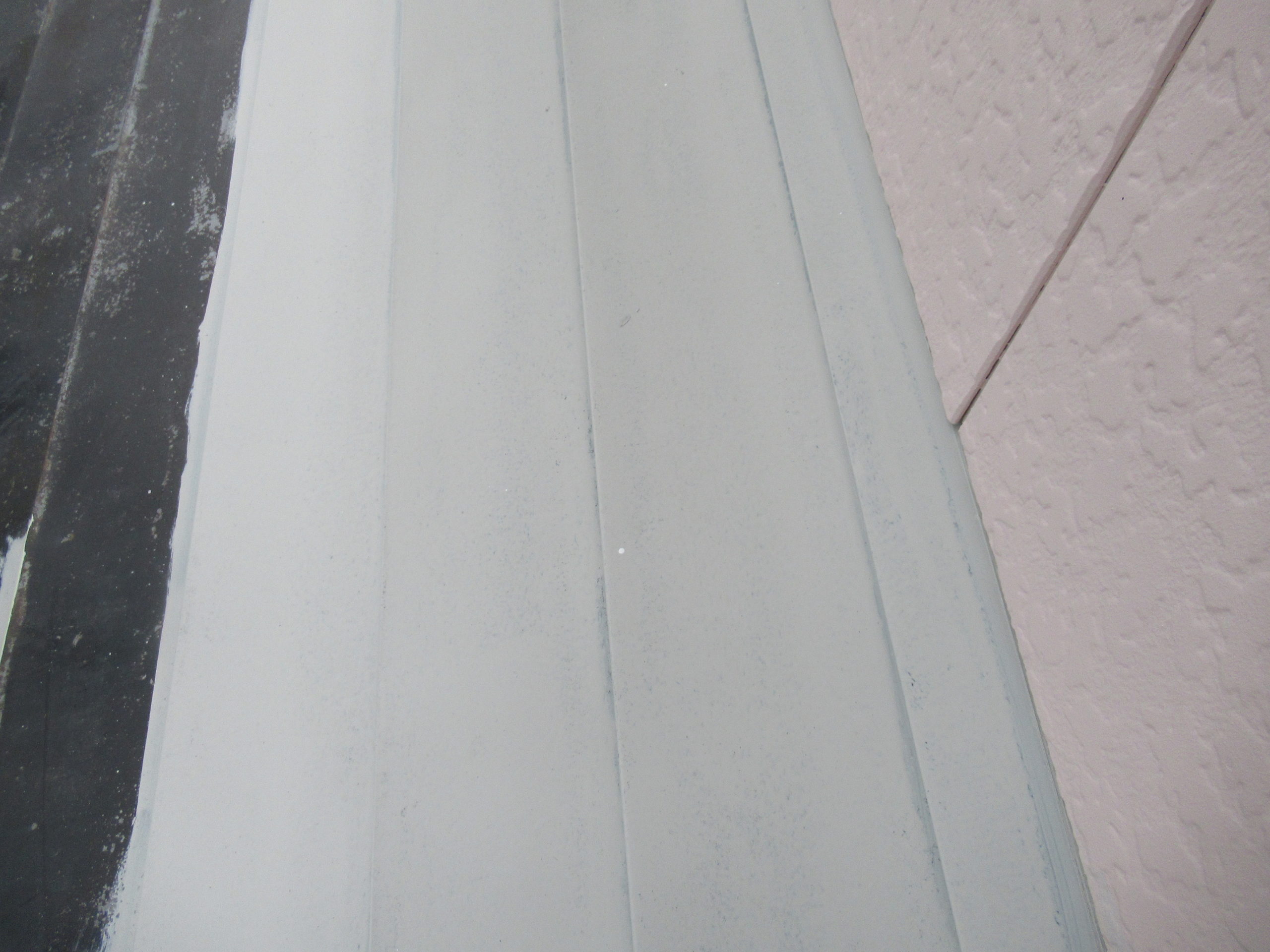 屋根は鋼板の為サビ止めを塗布します。 鋼板の場合下塗り材が錆止めです。 鋼板の重なり部分も刷毛で塗りこみ最後にローラーで塗ります。