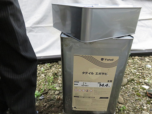 高圧洗浄後、サビ止めを塗ります。同じサビ止めでも二液のサビ止めです。(^o^)。サビ止めにもいろいろランクがあるのでどうせ使うなら良い下地材をお勧めします。