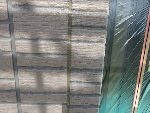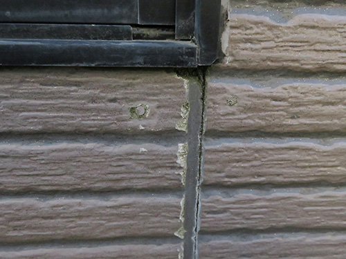 外壁のボードとボードの隙間に”コーキング”が打ってあります。あちこち裂けています。撤去し新しい外壁専用のコーキングを打ちます。
