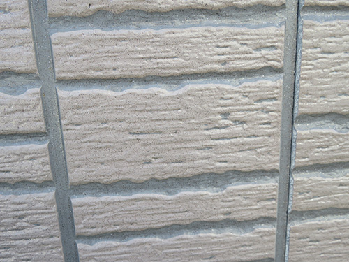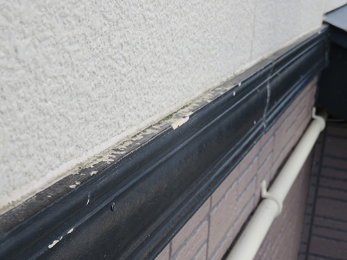 北側の帯板も同じようになっています。これは、二階の外壁に当たった雨水が下に流れ落ちて来てその水を全て受けるのが帯板に成ってしまいます。この部分はどんなに良い下地材や、塗料を使っても自然の力には勝てません。どうしても剥がれてきます。少し恰好はよくないですが、板金を巻くことをお奨めします。