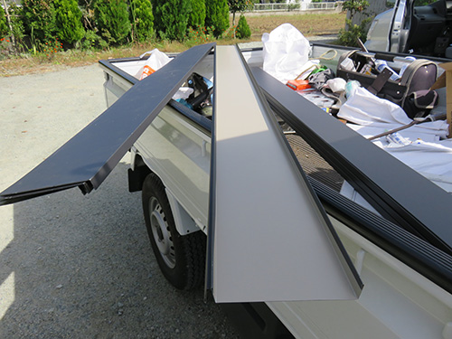 事前に作業場で加工した板金です。現場に持ってきて、寸法に合わせて切り、取り付けます。