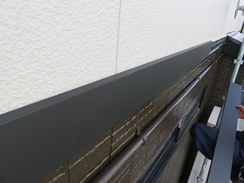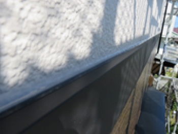 外壁の中間にある”帯板”ですが、二階の外壁に当たった雨水が下に降りてきて、帯板の天板に溜まってしまいます。その為、塗装前から帯板が壊れていました。すっかり壊れてしまった状態に、どんな下地材を塗って、良い塗料を塗ってもすぐに剥がれてきます。今回は、多少費用は掛かりましたが板金を巻きました。