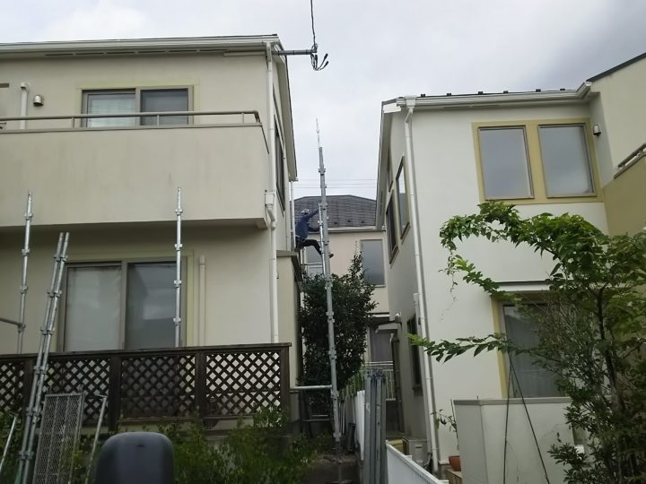 足場は、建物から約1Mくらい離れた場所に足場となる鉄パイプが建ちます。
