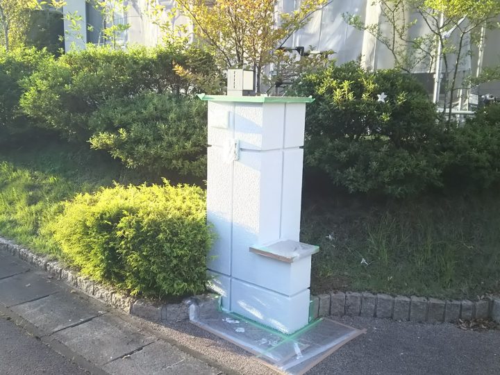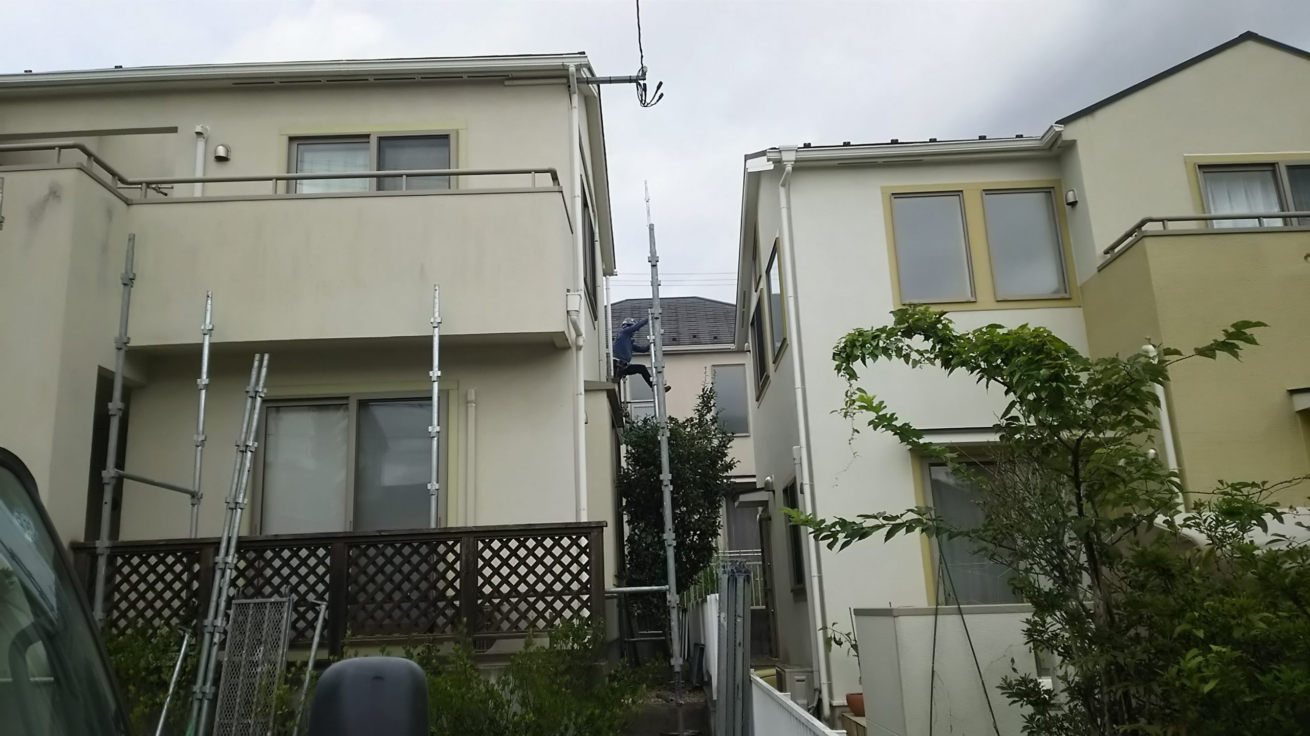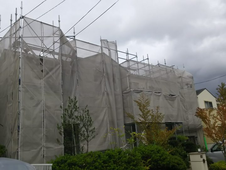 足場組は3時間から4時間ほどかかります。組み立てが終わったらメッシュシートを張り、足場組立完了です。