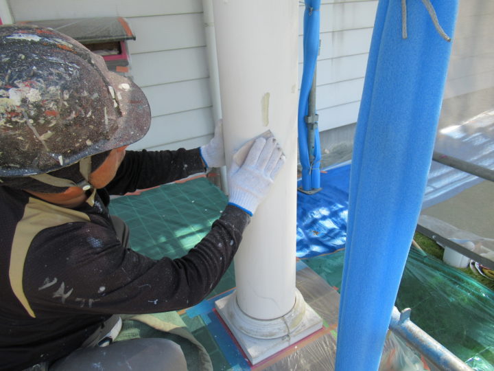玄関柱の表面の塗膜が剥がれっています。