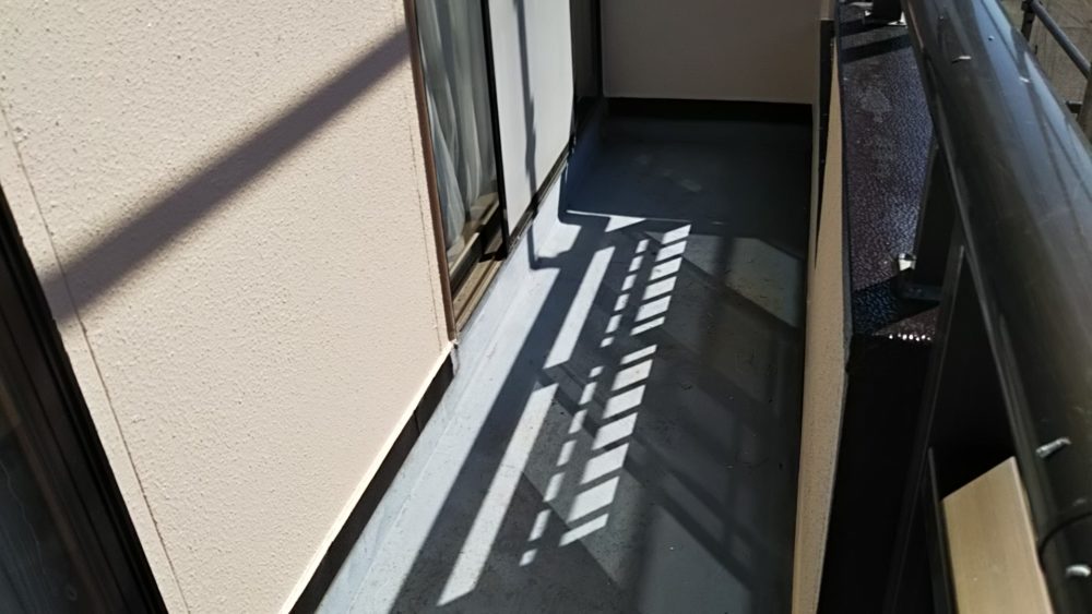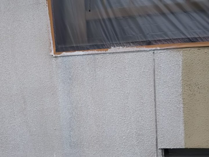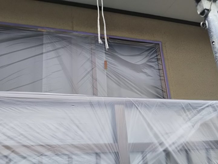 高圧洗浄が完了すると、塗装前の下準備として養生シートで窓やベランダ・瓦部などを汚さないように養生します。