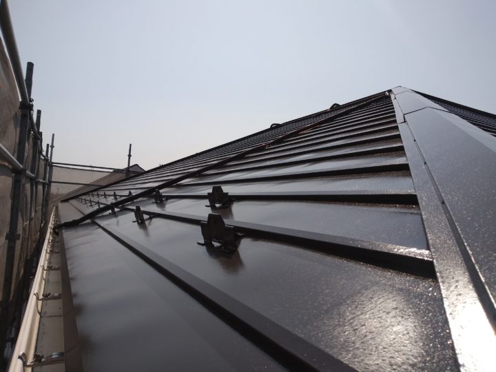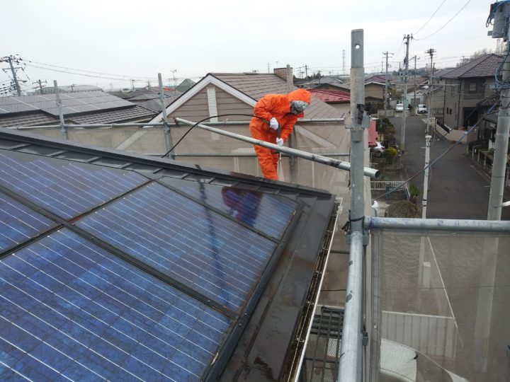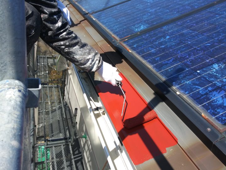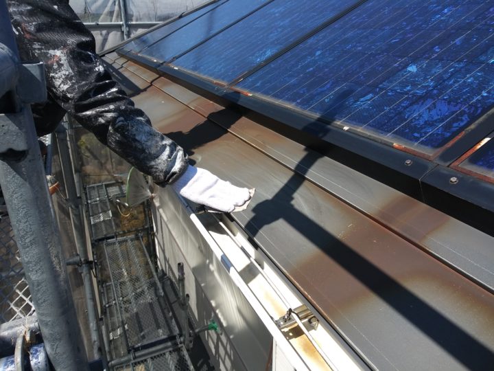 屋根鋼板はサビなどを落とす目的もありますが、塗料が密着しやすいように軽く目荒らしをします。